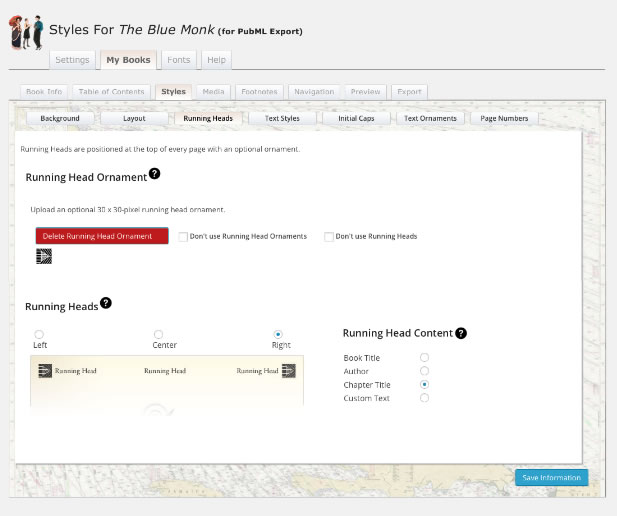 <PubML>™ eBooks offer "Running Heads" much like traditional, printed books. This is text that appears at the top of each page above the body text. Upload a custom running head ornament, hide ornaments, or hide running heads altogether.